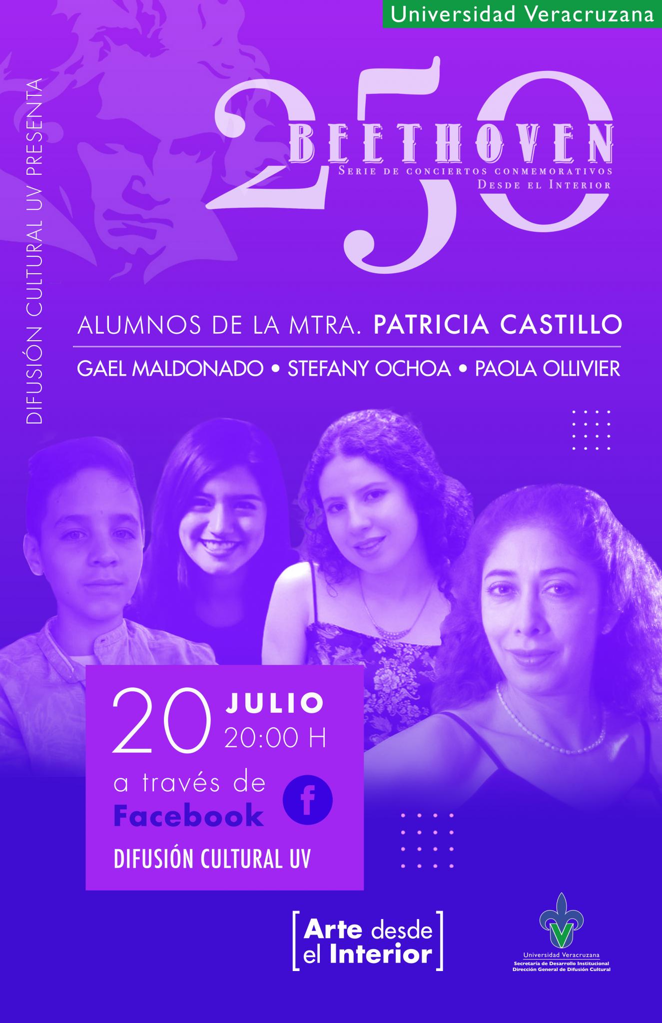 Patricia Castillo y sus alumnos Gael Maldonado, Stefany Ochoa y Paola Ollivier, se suman a este segmento de programa de solistas interpretando piezas de Beethoven en la conmemoración de su 250 aniversario, quien hasta nuestros días ha sido un parteaguas en la forma de concebir al artista como un clásico de la música con un legado inolvidable para la humanidad.