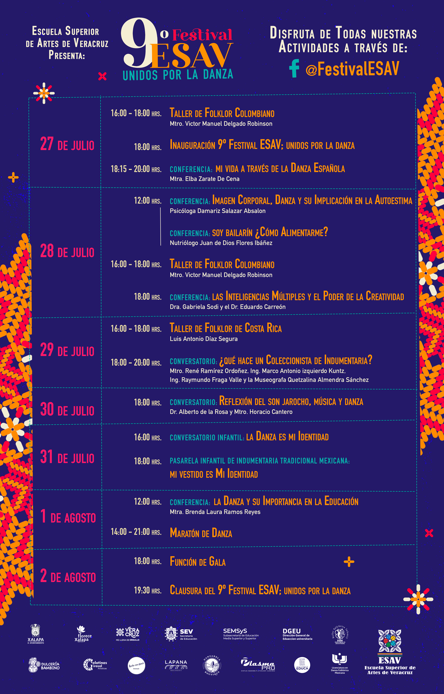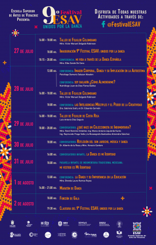 El festival se inaugurará el 27 de julio a las 18:00 horas a través de la pagina de Facebook @FestivalESAV con la conferencia “Mi vida a través de la danza española” a cargo de la Mtra. Elba Zarate De Cena. Así mismo, se impartirá un taller internacional de folklor Colombiano por el maestro Victor Manuel Delgado Robinson y de Costa Rica por el maestro Luis Antonio Díaz Segura a través de la plataforma Zoom del 27 al 29 de julio en un horario de 16:00 – 18:00 horas, de igual manera la Dra. Gabriela Sodi con él Dr. Eduardo Carreón se suman a las actividades del Festival con una conferencia con el tema “Las inteligencias múltiples y el poder de la creatividad”