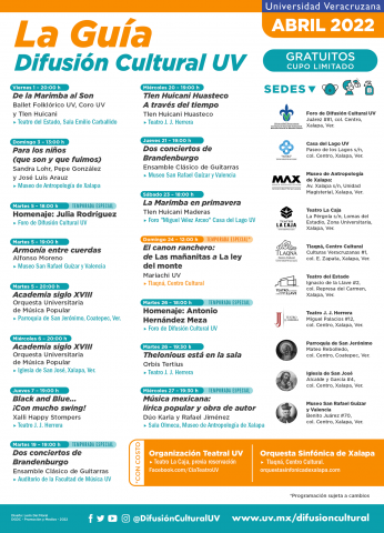 La Guía de Difusión Cultural, con eventos gratuitos, presenta al Ballet Folklórico UV, Tlen Huicani y el Coro UV en el Teatro del Estado “Gral. Ignacio de la Llave”, a Sandra Lohr en compañía de Pepe González y José Luis Arauz Lohr, Ensamble Clásico de Guitarras, Orquesta Universitaria de Música Popular, Xalli Happy Stompers, Orbis Tertius, Tlen Huicani Huasteco y Maderas, para más detalles La Guía completa se encuentra en las redes sociales @DifusiónCulturalUV y portal oficial https://www.uv.mx/difusioncultural/.