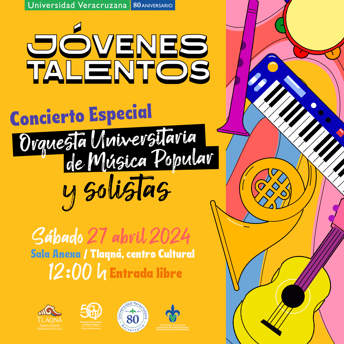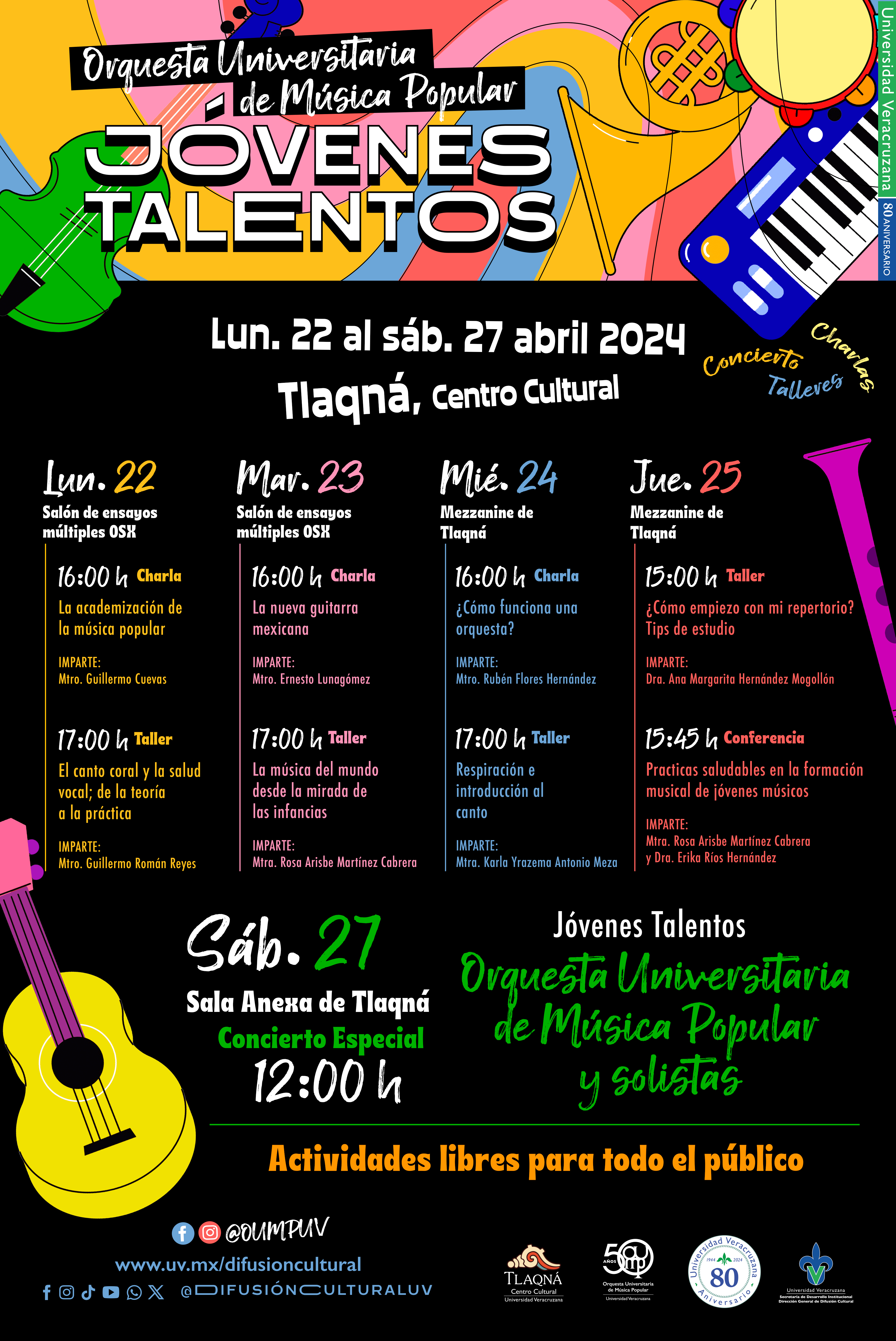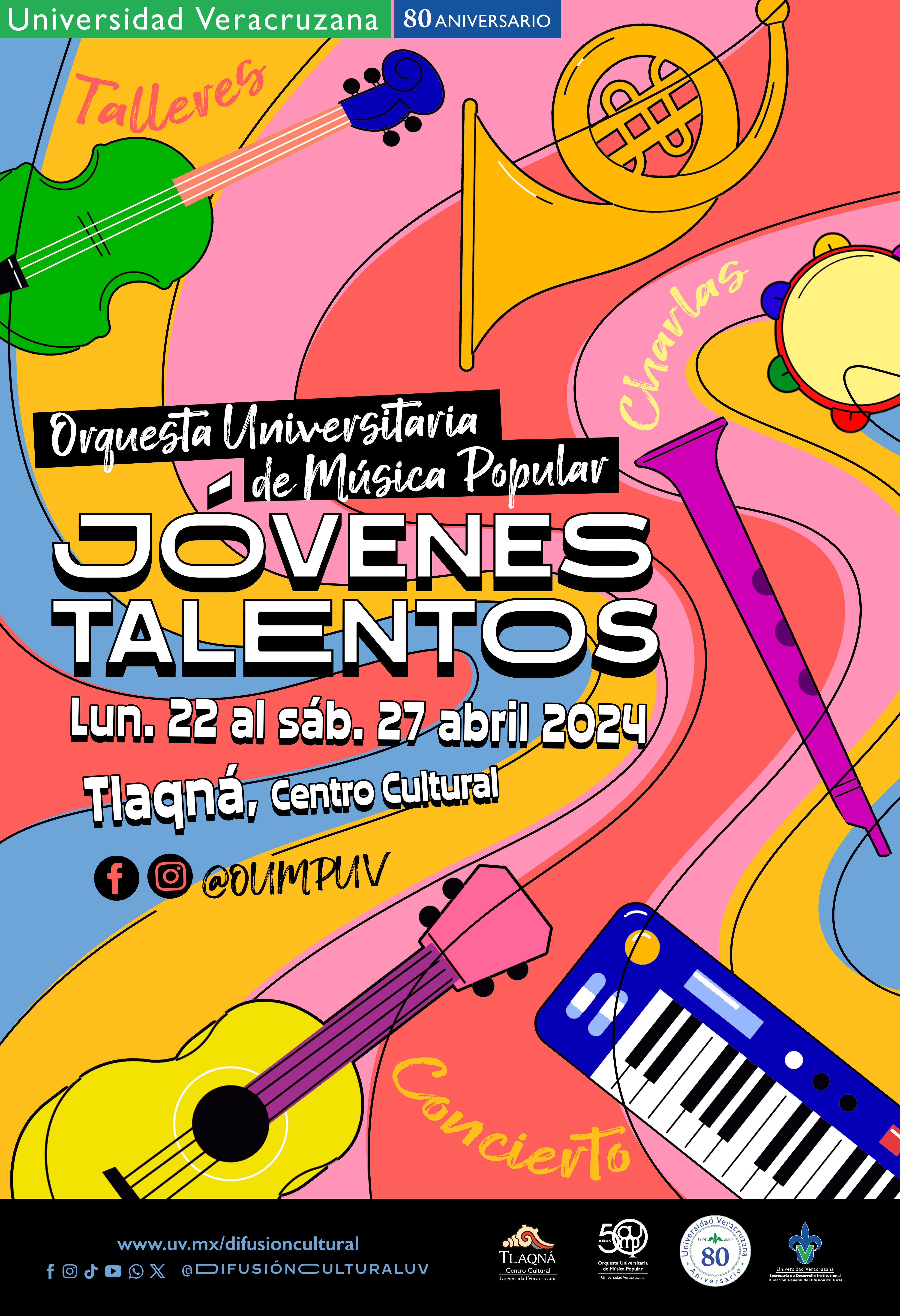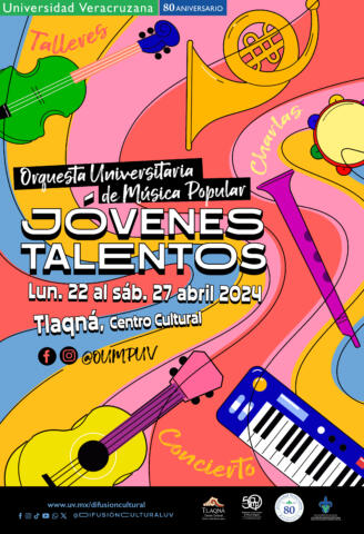 La Orquesta Universitaria de Música Popular invita a participar en las charlas, talleres y concierto de clausura del Festival Jóvenes Talentos con la Pop del 22 al 27 de abril en Tlaqná, Centro Cultural.