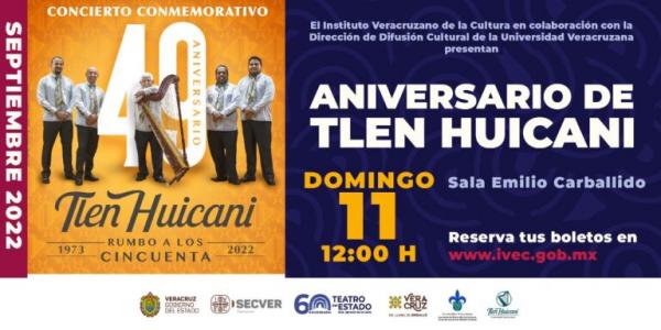 El Instituto Veracruzano de la Cultura en colaboración con la Dirección de Difusión Cultural de la Universidad Veracruzana invitan al concierto conmemorativo 49 aniversario de Tlen Huicani, rumbo a los 50 años, que se llevará a cabo este domingo 11 de septiembre en la sala Emilio Carballido del Teatro del Estado “Gral. Ignacio de la Llave”, en punto de las 12:00 horas.
