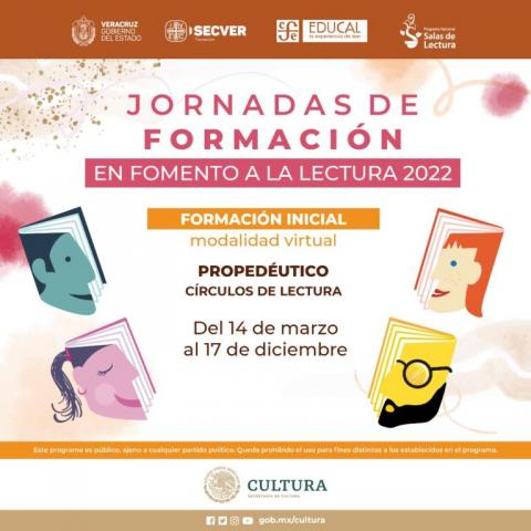 El Instituto Veracruzano de la Cultura, a través de su Programa de Fomento a la Lectura, en coordinación con la Dirección General de Publicaciones de la Secretaría de Cultura federal, convoca a las y los mediadores y promotores de lectura de la entidad a participar en las Jornadas de Formación en Fomento a la Lectura 2022, propuesta que busca fortalecer y ampliar la labor de mediación lectora en el estado de Veracruz.