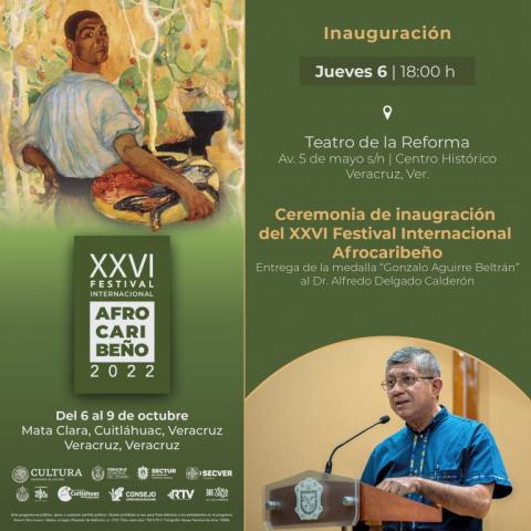 El Instituto Veracruzano de la Cultura entregará la Medalla Gonzalo Aguirre Beltrán al destacado académico Alfredo Delgado Calderón en el marco de la ceremonia de inauguración del XXVI Festival Internacional Afrocaribeño 2022, el próximo jueves 6 de octubre a las 18:00 horas, en el Teatro de la Reforma.