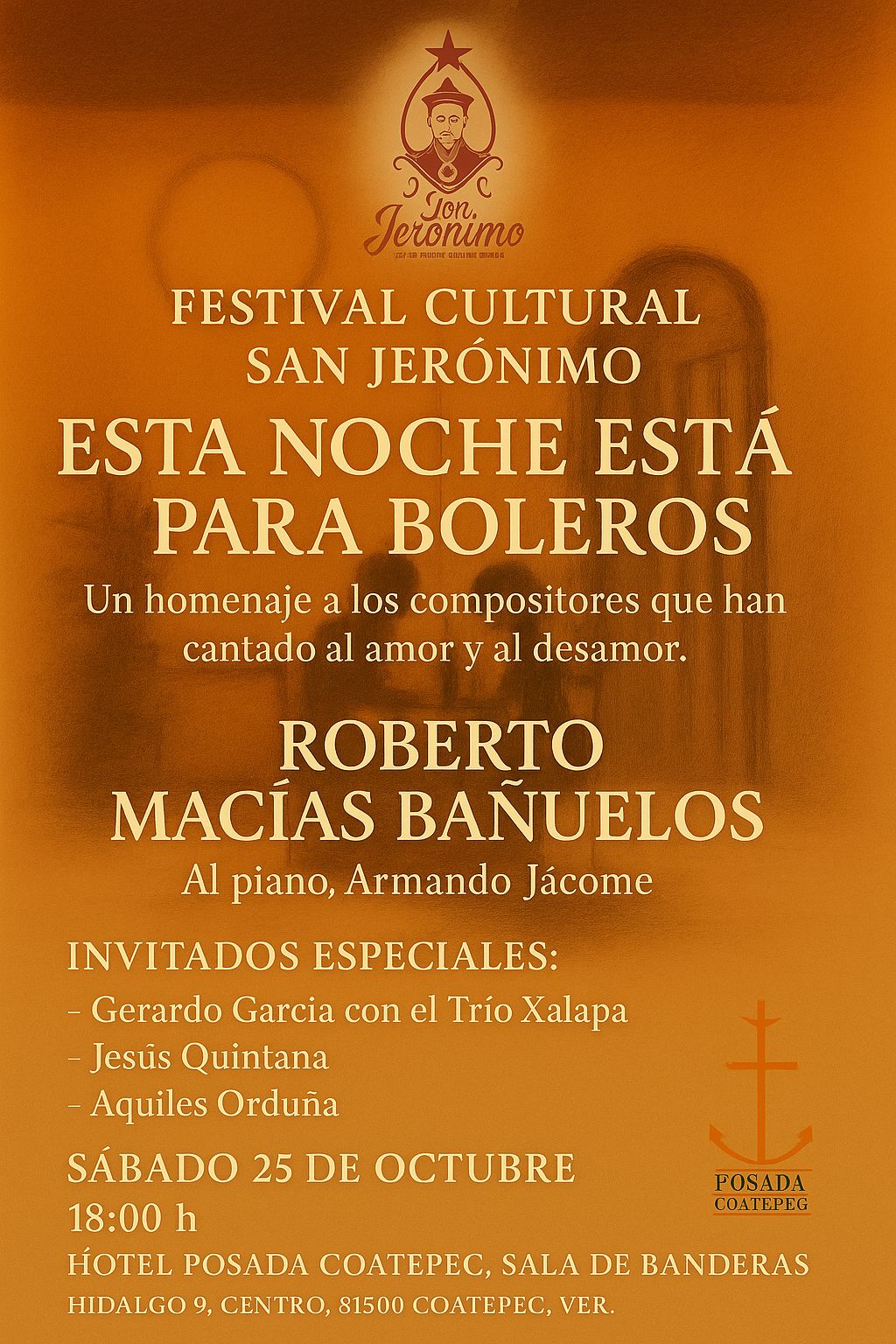 Habrá noche de boleros el próximo sábado en la Sala de Banderas del Hotel Posada Coatepec, organizado por Roberto Macías, quien estará acompañado al piano por el maestro Armando Jácome en este homenaje que ofrecen a todos aquellos compositores que han cantado al amor y al desamor.