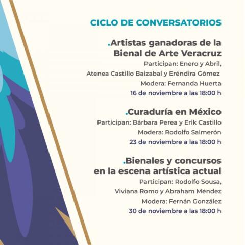 El ciclo de conversatorios se llevará a cabo los miércoles 16, 23 y 30 de noviembre a las 18:00 horas, en el auditorio de la Galería de Arte Contemporáneo. El miércoles 16 tendrá lugar la mesa de diálogo Artistas ganadoras de la Bienal de Arte Veracruz, que contará con la participación de las creadoras Enero y Abril, Atenea Castillo Baizabal y Eréndira Gómez; el 23 de noviembre los curadores independientes de talla internacional Erik Castillo y Bárbara Perea compartirán sus saberes en el conversatorio Curaduría en México; y el miércoles 30, Rodolfo Sousa, Viviana Romo y Abraham Méndez, artistas que han sido galardonados en diversos certámenes nacionales e internacionales, hablarán sobre sus experiencias en torno a la vigencia de las Bienales y concursos en la escena artística actual.