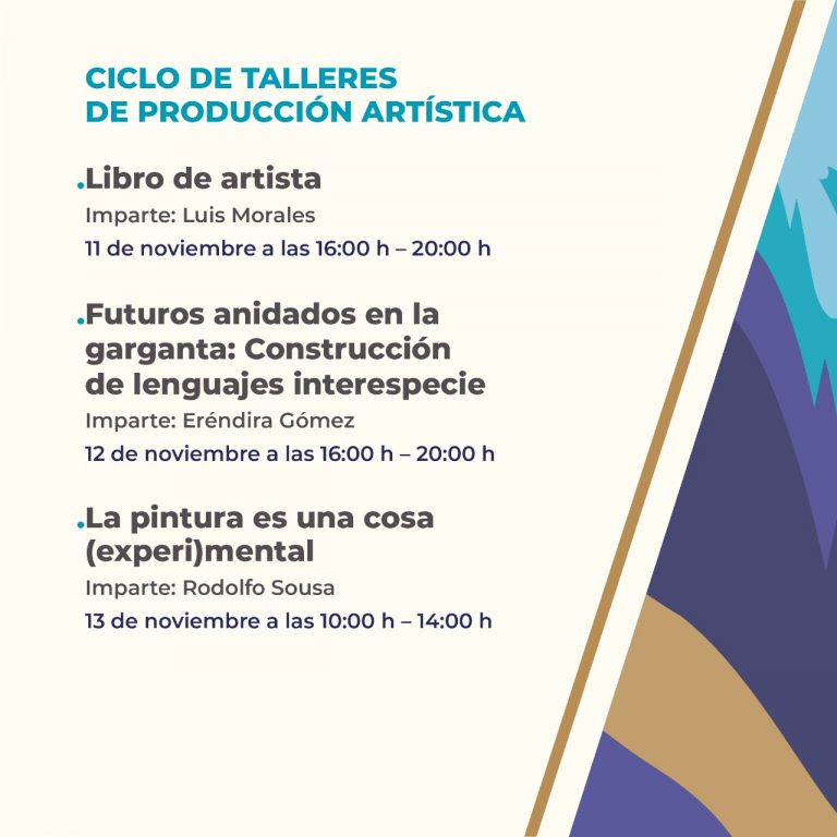 El ciclo de talleres de producción artística estará conformado por tres actividades especialmente diseñadas para las y los estudiantes o profesionistas de las artes visuales, plásticas, diseño o afines. El Taller de libro de artista será impartido por Luis Morales el viernes 11 de noviembre, de 16:00 a 20:00 horas; Futuros anidados en la garganta: construcción de lenguajes interespecie, un taller de medios alternativos facilitado por Eréndira Gómez, se realizará el sábado 12, de 16:00 a 20:00 horas; y el domingo 13 de noviembre Rodolfo Sousa coordinará el taller La pintura es una cosa (experi)mental, en horario de 10:00 a 14:00 horas. Las y los artistas interesados en participar pueden registrar sus datos en los siguientes formularios: