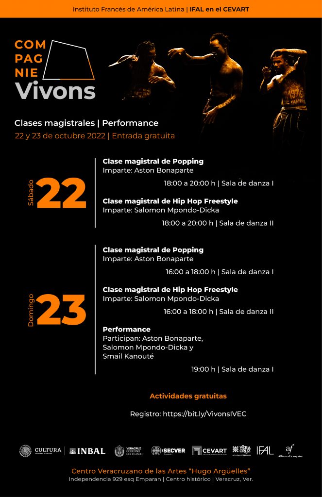 El Instituto Veracruzano de la Cultura a través del Centro Veracruzano de las Artes “Hugo Argüelles”, en conjunto con la Coordinación Nacional de Danza del Instituto Nacional de Bellas Artes y Literatura (INBAL), el Instituto Francés de América Latina (IFAL) y la Embajada de Francia en México, invitan a participar en el ciclo de actividades que la compañía de danza francesa Compagnie Vivons llevará a cabo de manera gratuita el sábado 22 y domingo 23 de octubre en las salas del CEVART.