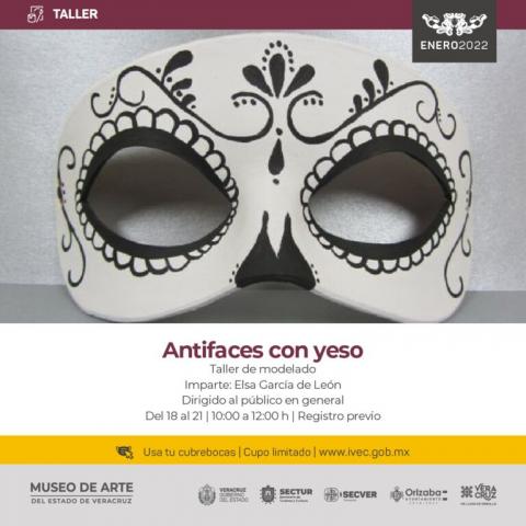 El IVEC reitera la invitación al taller de modelado “Antifaces con yeso”, que se realizará del martes 18 al viernes 21 de enero, de las 10:00 a las 14:00 horas, en el Museo de Arte del Estado de Veracruz. Las y los interesados en participar podrán registrarse en https://forms.gle/iXcJFmr7DvxmPRY57. Conoce todas las actividades del MAEV a través de la cuenta de Facebook @MAEVorizaba y consulta la cartelera completa del Instituto en www.ivec.gob.mx.