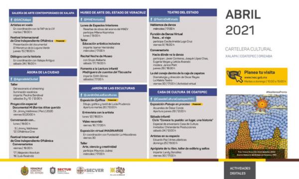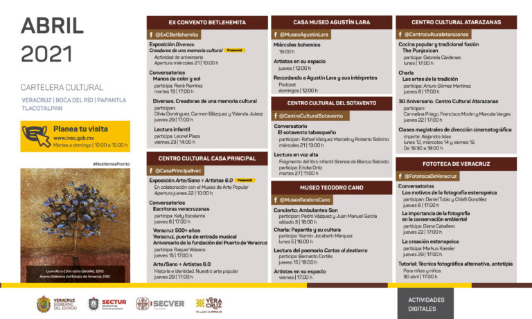 Durante el mes de abril, el Instituto Veracruzano de la Cultura continúa ofreciendo una interesante y variada propuesta cultural en modalidad virtual, que comprende conversatorios, charlas, talleres, música, danza, teatro y literatura. Además, de manera paulatina, en el marco de un protocolo sanitario, retoma actividades presenciales en sus recintos presentando exposiciones y proyecciones documentales.