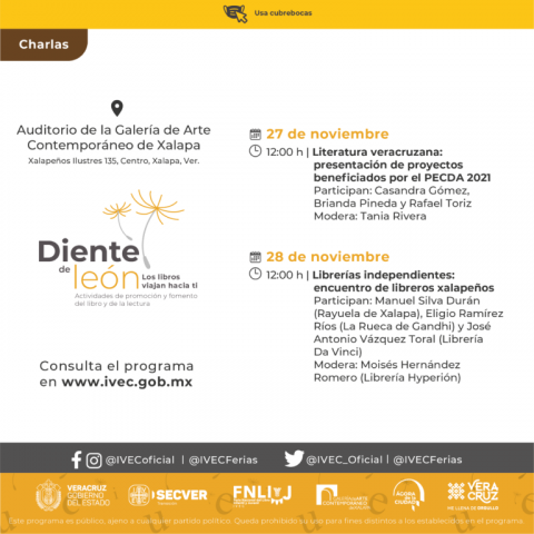 El Instituto Veracruzano de la Cultura invita a disfrutar del ciclo de charlas del festival Diente de león. Los libros viajan hacia ti, que se realizará en modalidad presencial del 24 al 28 de noviembre, en punto de las 12:00 horas, en el auditorio de la Galería de Arte Contemporáneo de Xalapa. En los cinco diálogos se abordarán temas como la creación literaria, la ilustración, la edición, la promoción de la literatura y la distribución librera.