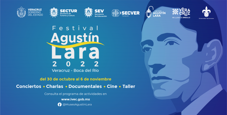 El Instituto Veracruzano de la Cultura invita a disfrutar del Festival Agustín Lara 2022, que se llevará a cabo del 30 de octubre al 6 de noviembre para rendir homenaje a nuestro brillante músico-poeta, cantante y compositor veracruzano con un programa de conciertos, charlas, documentales y talleres. Las actividades tendrán lugar en la Casa Museo Agustín Lara, ubicada en la ciudad de Boca del Río; el Callejón Toña la Negra del emblemático Barrio de La Huaca y la avenida Martí, en el puerto de Veracruz; algunas de ellas se transmitirán desde la página de Facebook de la Casa Museo Agustín Lara: @MuseoAgustínLara.