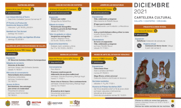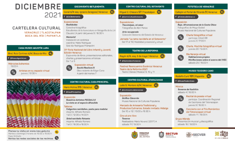 Durante esta temporada decembrina el Instituto Veracruzano de la Cultura propone al público un variado programa de actividades conformado por presentaciones editoriales y artísticas, funciones de cine, exposiciones y talleres que se llevarán a cabo en modalidad híbrida, a través de plataformas digitales y de manera presencial en la red de recintos culturales con sede en Xalapa, Coatepec, Veracruz, Boca del Río, Orizaba, Papantla y Tlacotalpan.