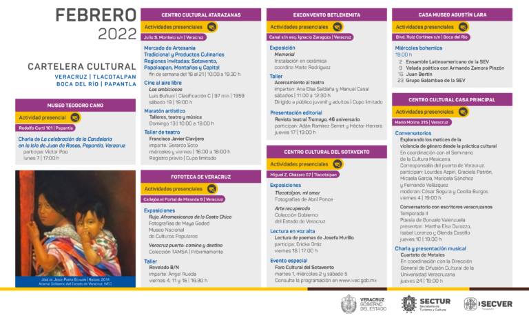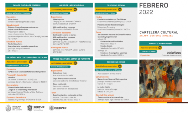 El Instituto Veracruzano de la Cultura presenta una oferta cultural diversa durante el mes de febrero, integrada por exposiciones, conversatorios, talleres, música, teatro, literatura y cine, que tendrán lugar en la red de recintos culturales de Xalapa, Veracruz, Boca del Río, Orizaba, Papantla y Tlacotalpan.