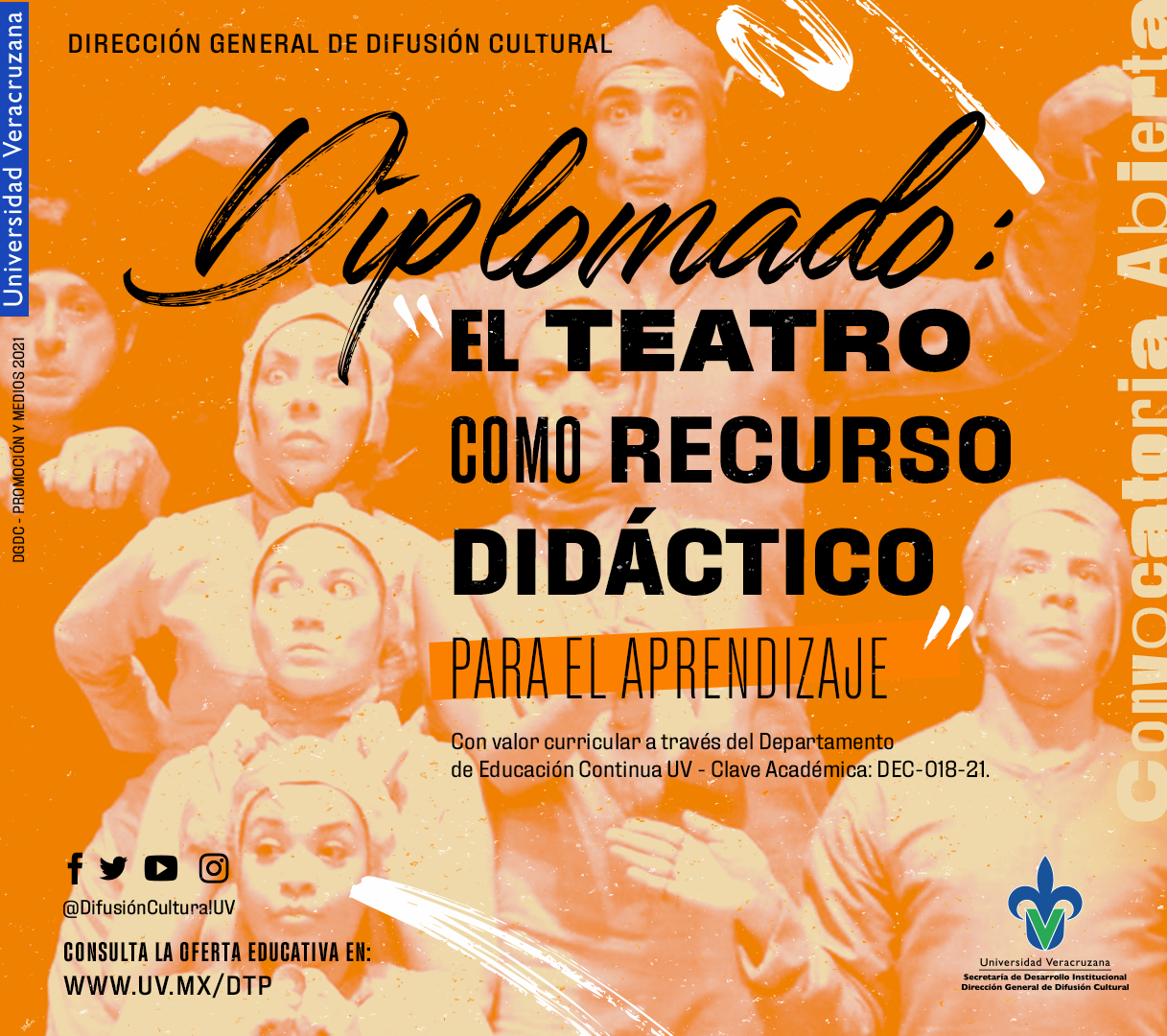 La Dirección General de Difusión Cultural de la Universidad Veracruzana, presenta la oferta de diplomados para este semestre, la cual incorpora un nuevo diplomado en teatro pedagógico, esta oferta educativa cuenta con valor curricular y se encuentra registrada ante Educación Continua UV, lo cual garantiza su validez oficial. La fecha límite para realizar su preinscripción es el domingo 26 de septiembre de 2021.
